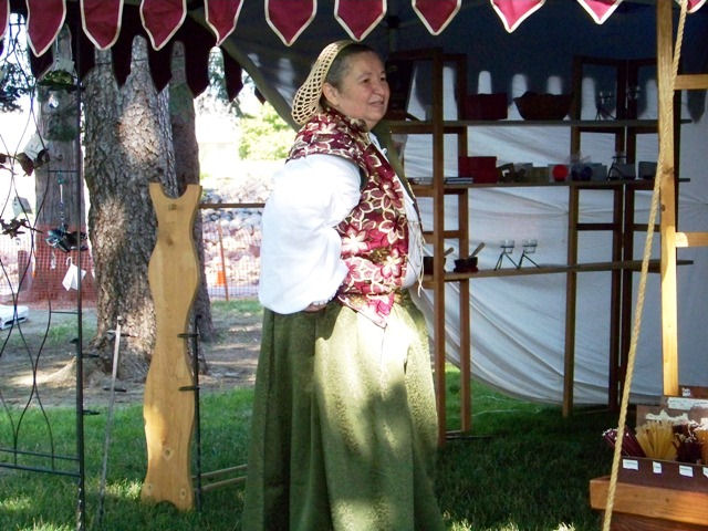 More details on "New Worlds' Tour -- continued" and past shows.The Stage -- If you decided to have a period looking portable theatre for your faire, you might consider creating the following: 1) modeled loosely after The Globe's performing space, 2) large tented look with flags on top, 3) curtained entrances and exits, 4) 24' by 10' performing space, 5) controlled sightlines, 6) backstage area for storage, preparation, moving on/off, and FX, 7) green room, 8) costume storage and changing area, and 9) a concession or merchant space. It also would need to be rain, fire, and wind proof. Then you realize what it would cost for designing, building, revising, storing, repairing, erecting, tearing down, plus "maintaining" the theatre during an event.